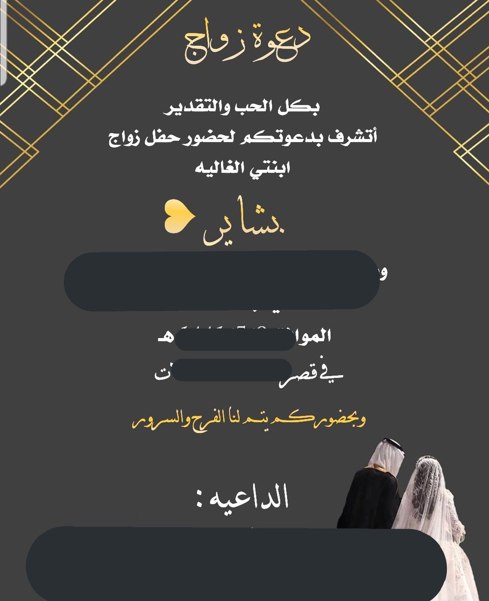 نموذج صورة لبطاقة دعوة.سعر البطاقة ٥٠ ريال للتواصل: كل شيء تحبه في سوق.كوم الان اصبح على أمازون السعودية. نحتفل معا في قاعة بمناسبة زفاف ابنتنا. دعوات الزفاف بطاقة دعوة رسالة دعوة دعوة الكترونية عرس صيني عرس غربي نحن سنتزوج خلفية زفاف تزوج حفل زواج حفل زفاف دعوة زفاف الخلفية. دعوة زفاف أنيقة ومميزة باستخدام كتابات مزينة بشكل رائع.